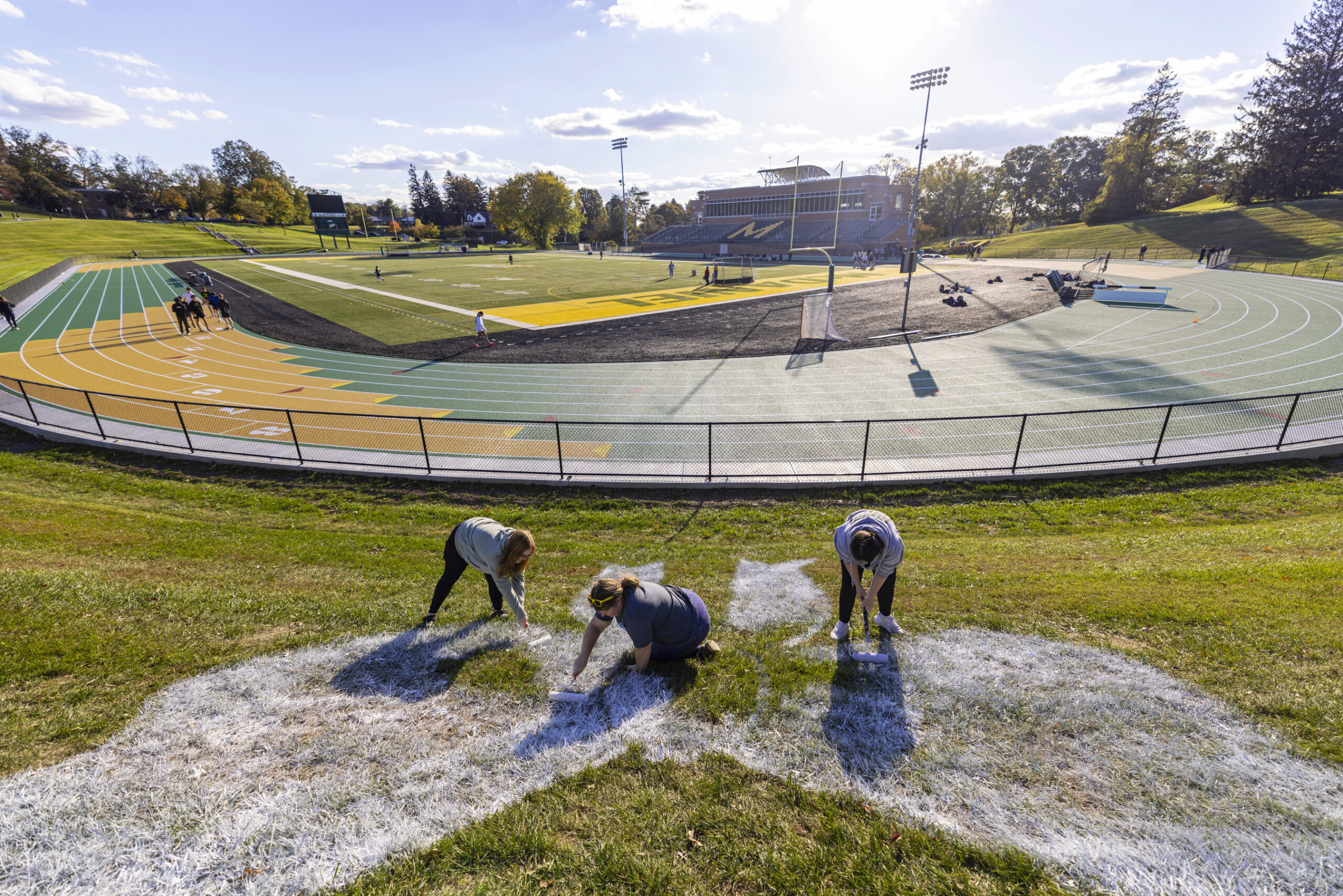 As announced during the 2024 Homecoming pregame celebration, construction of McDaniel’s bold new track has finally come to completion. Brandishing our signature green-and-gold stripes, the updated facility is able to host track and field competitions for the first time in years — now with improved safety and a design that reflects McDaniel’s pride in its student-athletes.